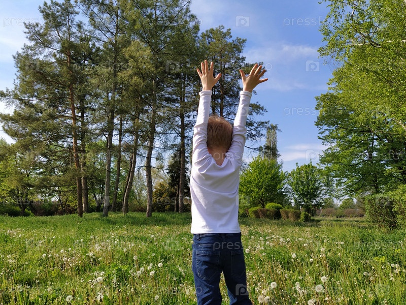 Мальчик идет по полю и воздевает руки к небу. Мужчина фотографируется сзади. Концепция гармонии с природой и свободой. Ребенок в парке. Окружающая среда и образ жизни