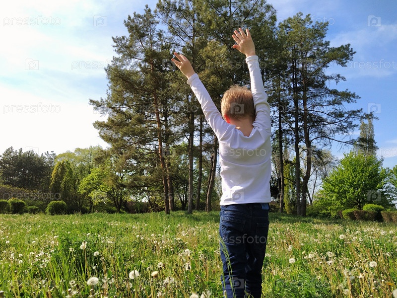 Мальчик идет по полю и воздевает руки к небу. Мужчина фотографируется сзади. Концепция гармонии с природой и свободой. Ребенок в парке. Окружающая среда и образ жизни