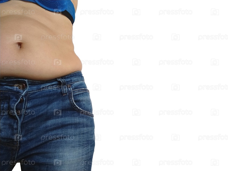 Обвисший живот. Складки кожи и жира по бокам нависают над талией джинсов. Фигура, испорченная перееданием или беременностью. Ожирение и диабет. Белый фон. Целлюлит дряблых мышц