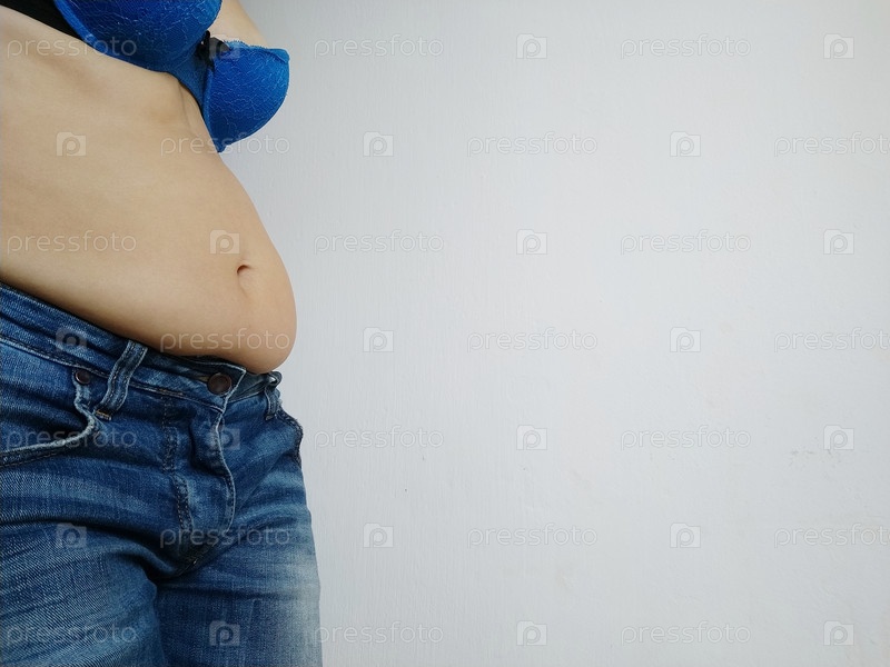 Обвисший живот. Складки кожи и жира по бокам нависают над талией джинсов. Фигура, испорченная перееданием или беременностью. Ожирение и диабет. Нездоровый образ жизни. Дряблые мышцы от целлюлита