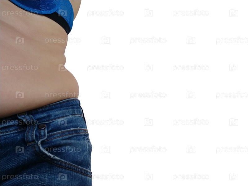 Обвисший живот. Складки кожи и жира по бокам нависают над талией джинсов. Фигура, испорченная перееданием или беременностью. Ожирение и диабет. Белый фон. Дряблые мышцы от целлюлита