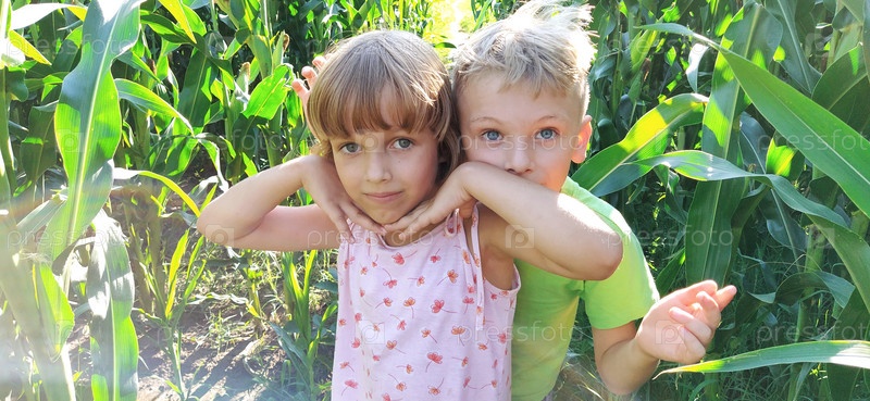 Дети в кукурузе. Мальчик и девочка 6 и 7 лет идут по тропинке между высокими кустами кукурузы. Игра в поле. Глядя в камеру. Летнее время. Дети со светлыми волосами