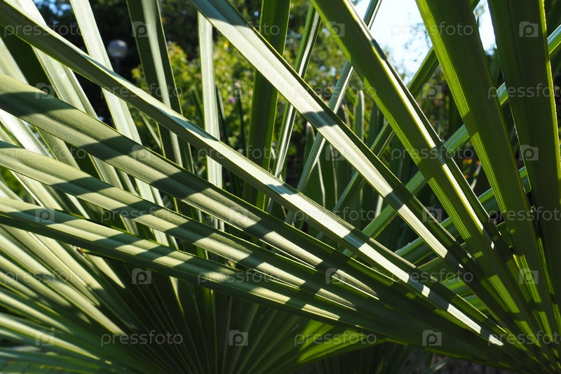 Текстура пальмовых листьев с тенью и светом. Пальмовые листья ярко-зеленого цвета. Тропический красивый фон. Летний пляжный туризм