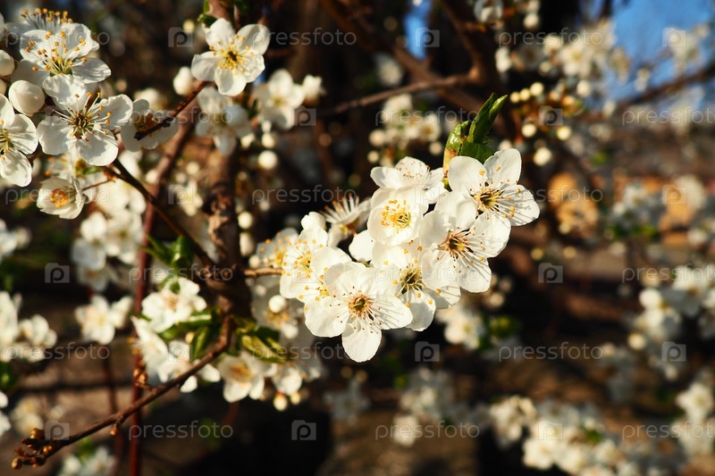 Цветение вишни, черешни и черемухи. Красивые ароматные белые цветы на ветвях в золотой час. Весенние белые цветки собраны в длинные густые поникающие кисти