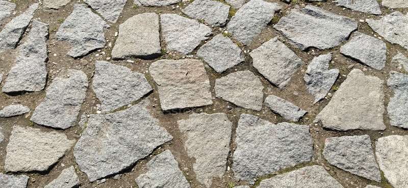 Тротуар вымощен неровными натуральными серыми и коричневыми камнями. Между щебнем булыжника есть мелкая галька, земля, песок, трава. Солнечное освещение. Площадь в старом европейском городе