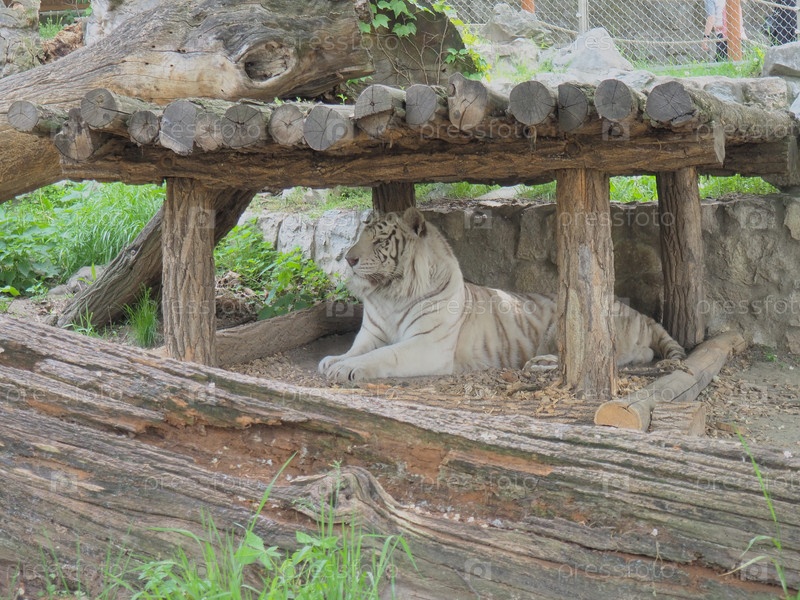 Бенгальский тигр, Panthera tigris tigris или Panthera tigris bengalensis. Мутация альбиноса - белый тигр. Животное отдыхает в зоопарке. Тигр гордо держит голову. Портрет королевского бенгальского тигра
