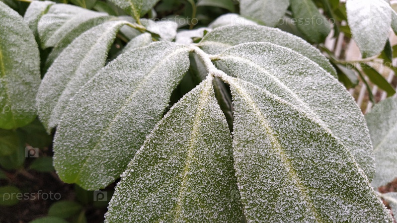 Красивые большие зеленые листья с белым инеем на поверхности. Кристаллы замороженной воды. Фикусное дерево или вечнозеленый кустарник, сфотографированные при высокой влажности в морозную погоду