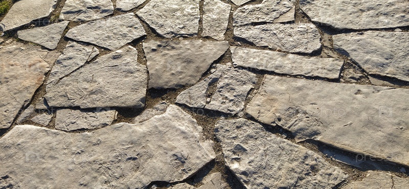Брусчатка из больших плоских камней в центре старого города. Булыжники, разделенные слоями, укладываются по порядку, как дорожная плитка. Натуральные серые и коричневые тона камня на закате