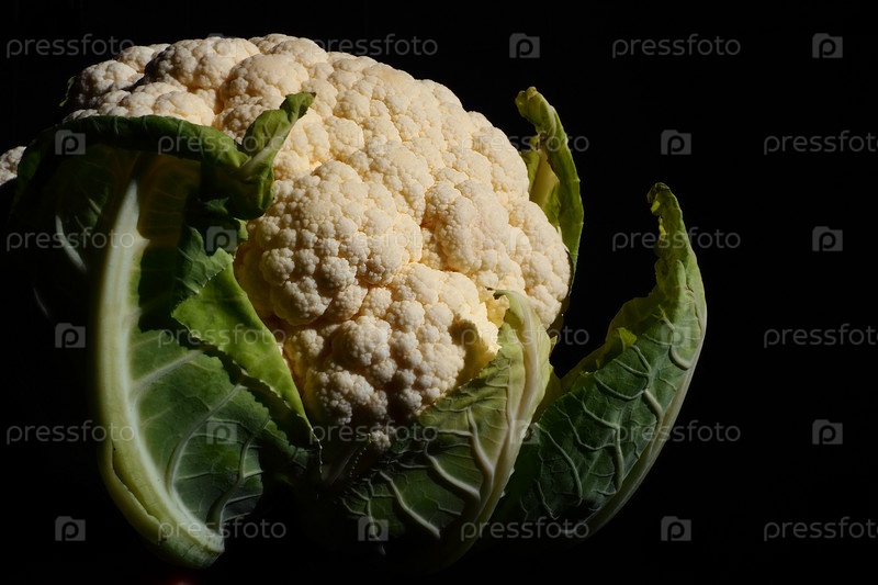 Крупный план цветной капусты на черном фоне. Боковое освещение. Свежая кочанка. Зеленые овощи. Brassica oleracea из рода Brassica семейства Brassicaceae. Здоровое питание и вегетарианство