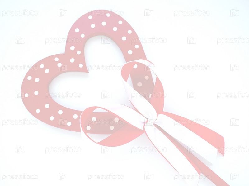 День святого Валентина бледный фон. Красное деревянное сердце с белыми точками и ленточным бантом на палочке. Белый фон. Красивый бант в качестве украшения. Любовь и отношения