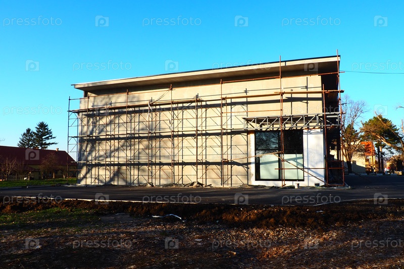Леса на новый одноэтажный дом. Фасадные работы. Строительный бизнес. Малоэтажное частное здание. Оштукатуривание стены здания. Здание магазина. Металлоконструкции производства