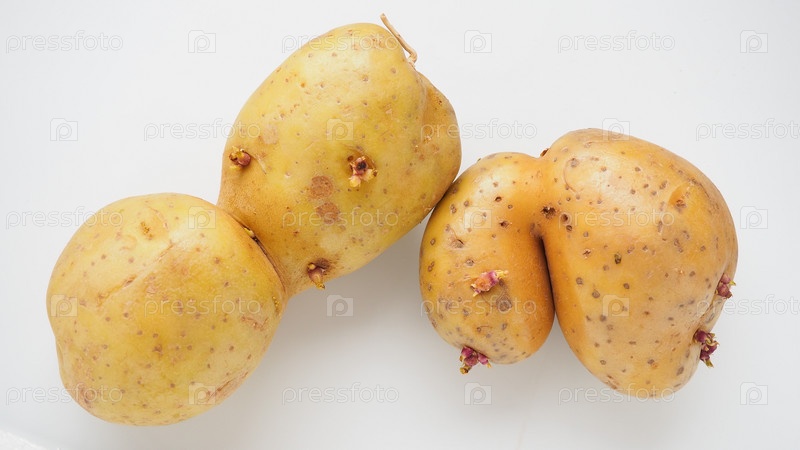 Уродливый картофель на белом фоне. Необычный овощ, ноль отходов. Овощной прут неправильной формы. Влияние диоксинов, радиации, пестицидов и мутагенных факторов на развитие растений