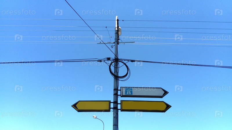 Правый указатель пустой белый знак направления. указатели дорожных знаков. Желтые и белые стрелки — это знаки на дороге или на перекрестке. голубое небо на заднем плане. Круглые электрические провода