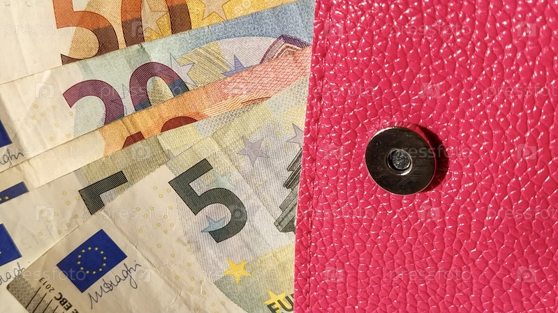 Бумажные банкноты евро. Европейская валюта на белом фоне крупным планом. Кошелек или портмоне ярко-розового цвета с металлической кнопкой, из которой выкладываются деньги. Банкноты 5, 10, 20, 50 и 100