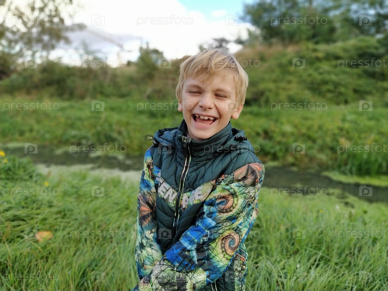 Белокурый мальчик 8 лет смеется осенью на прогулке у заболоченного пруда. Бурная эмоция веселья на лице ребенка. Повседневная теплая одежда. Зеленая куртка
