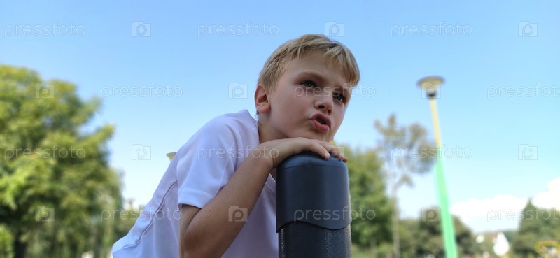 Задумчивый мальчик на детской площадке. Ребенок задержался на металлической конструкции и что-то сказал. Мальчик со светлыми волосами