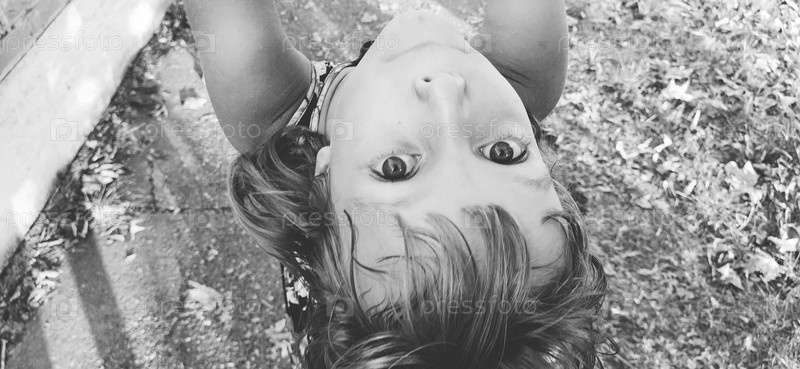 Красивая кавказская девушка. Ребенок крутится и играет. Посмотрите вверх ногами, сбоку. Черно-белая монохромная активная фотография. Ретро винтажный стиль. Счастливое детство