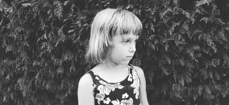 Красивая кавказская девушка. Ребенок смотрит в сторону. Черно-белая монохромная фотография. Ретро винтажный стиль. Счастливое детство. Стена туи на заднем плане