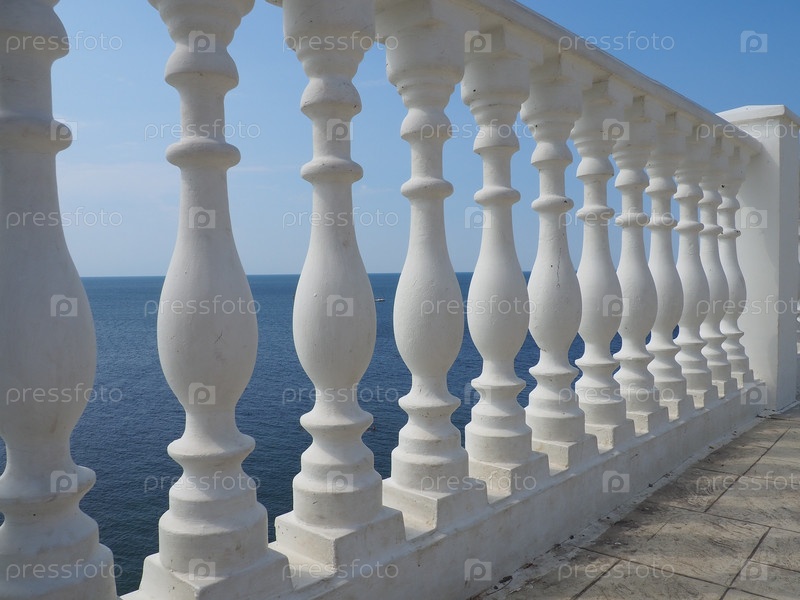 Балюстрада с видом на море, небо и горизонт, ограждение, состоящее из ряда фигурных балясин, соединенных сверху перилами или горизонтальной балкой. Перила из фигурных белых столбов