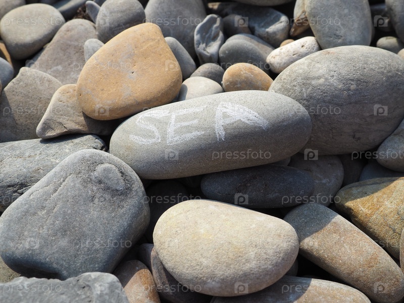 Овальные камни, крупная гладкая морская галька, освещенная летним солнцем. На камне написано слово море. Летний отдых на курорте, велнес, морские приключения и удовольствия. Камень серый фон