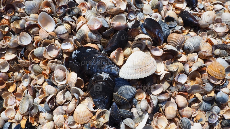Раковины брюхоногих двустворчатых моллюсков. Азовское и Черное моря, Голубицкая. Ракушки на берегу. Cerastoderma lamarcki, Hypanis colorata, Anadara inaequivalvis, Mytilus galloprovincialis