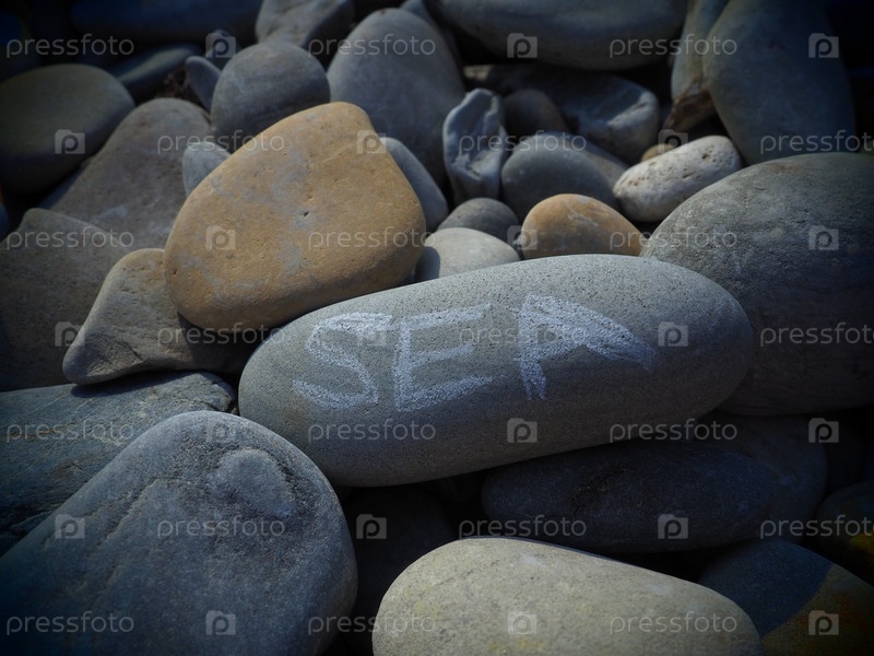 Овальные камни, крупная гладкая морская галька, освещенная летним солнцем. На камне написано слово море. Летний отдых на курорте, велнес, морские приключения и удовольствия. Камень серый фон