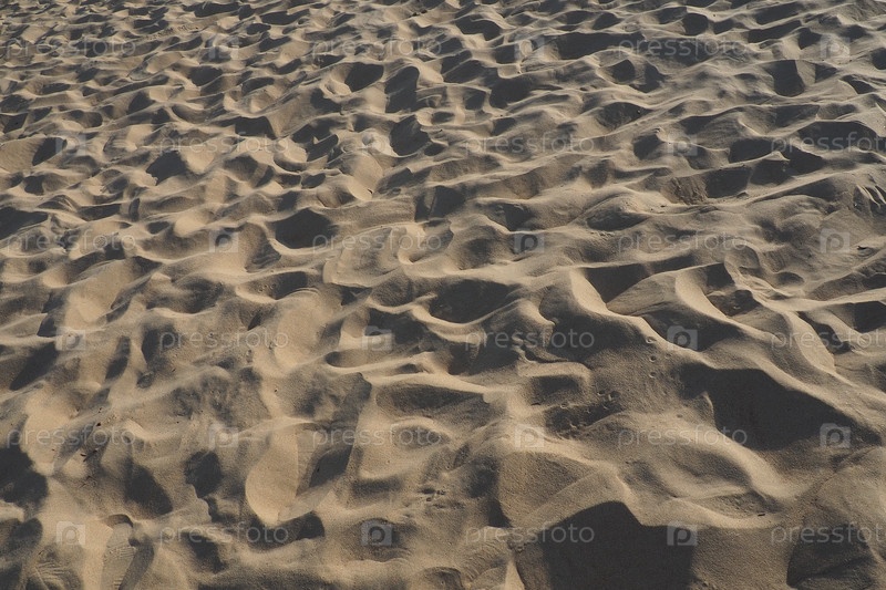 Песок при слабом солнечном свете в золотой час. Пустой пляж, следы и вмятины на песке. Дюны Черного моря. Рыхлая осадочная порода, состоящая из зерен горного кварца и минерала двуокиси кремния