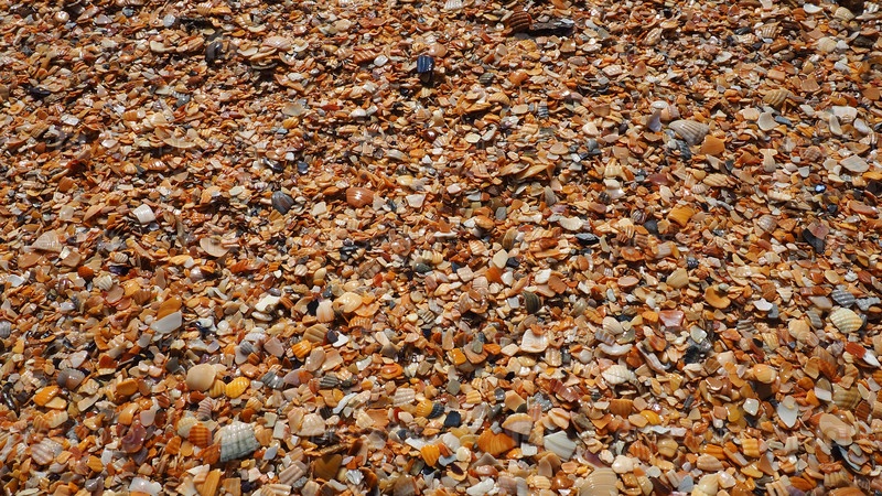 Раковины брюхоногих двустворчатых моллюсков, обитающих в Азовском и Черном морях. Бежевые, коричневые, черные, белые ракушки на берегу. Деревня Голубицкая. Сломанные маленькие ракушки