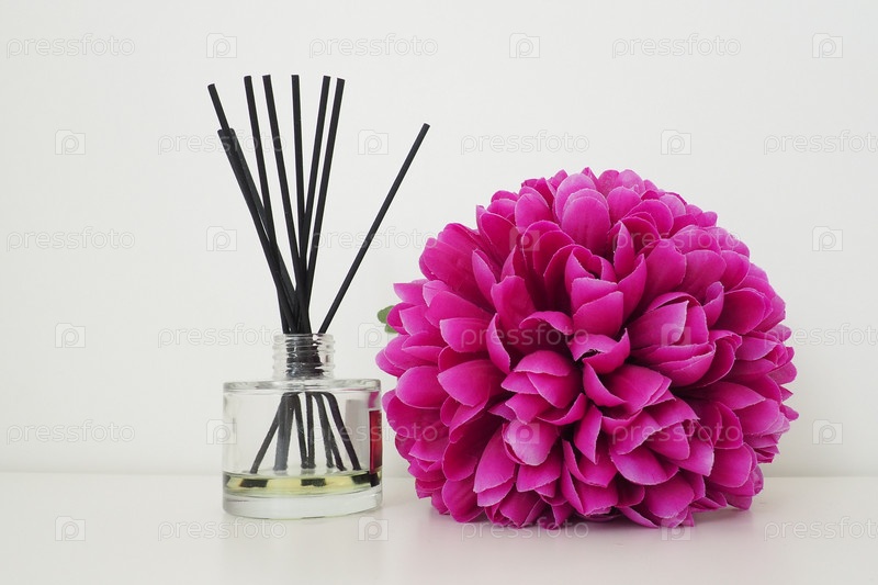 Композиция с ароматическими палочками, эфирным маслом в стеклянной вазе и ярким розово-сиреневым махровым искусственным цветком в интерьере белой комнаты. белый фон