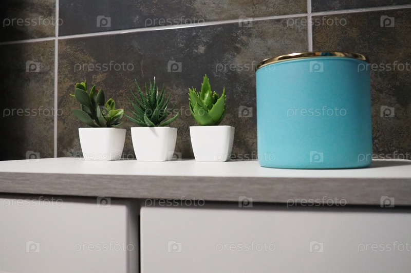 Элементы декора ванной комнаты. Голубая баночка с кремом или маслом, зеленые искусственные растения в маленьких белых горшочках стоят на полке шкафа. Черная настенная плитка. Интерьер ванной и туалета