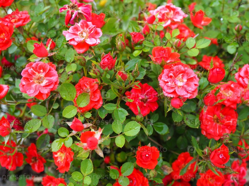 Кусты красных роз. много маленьких красных роз на кустах