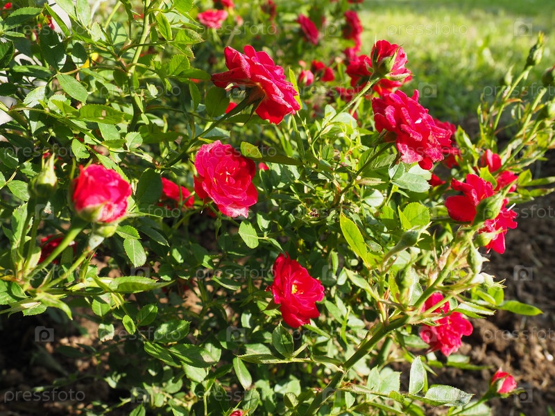 Кусты красных роз. много маленьких красных роз на кустах