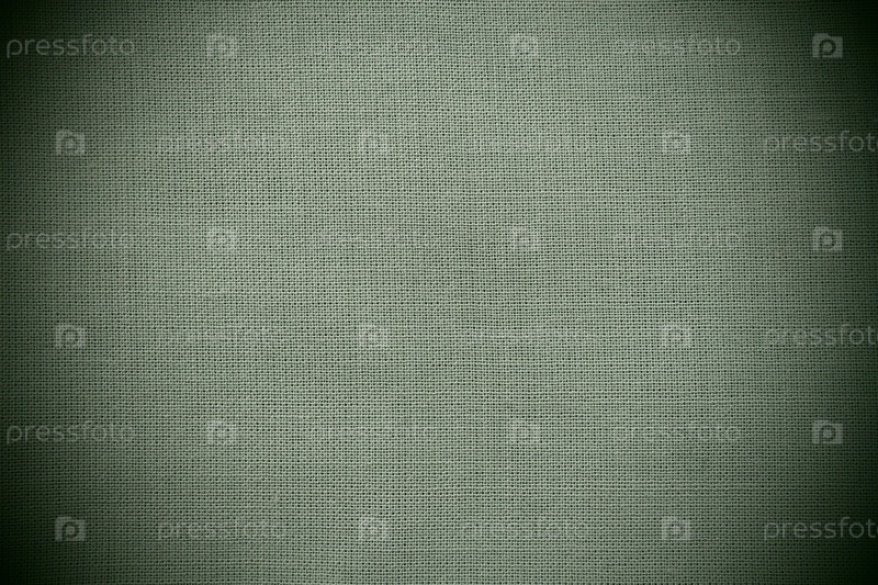 Текстура натуральной зеленой ткани крупным планом. Текстура ткани выполнена из натурального хлопкового или льняного текстильного материала. Зеленый холст фон. Гладкая поверхность, гладкая ткань. Темное виньетирование