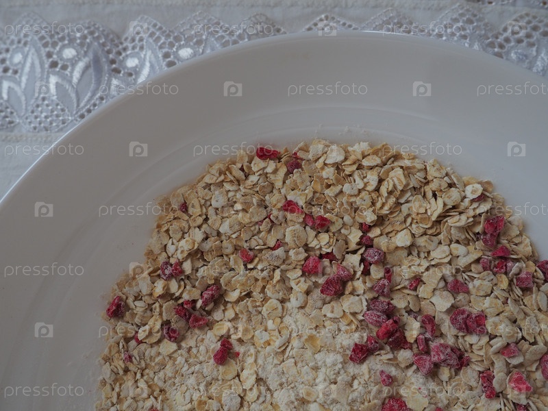 Органическая гранола с овсом, сахарной пудрой и сушеной малиной. Полезные мюсли в виде сухой смеси. Антидиабетическая, низкокалорийная, здоровая диета. Белая посуда
