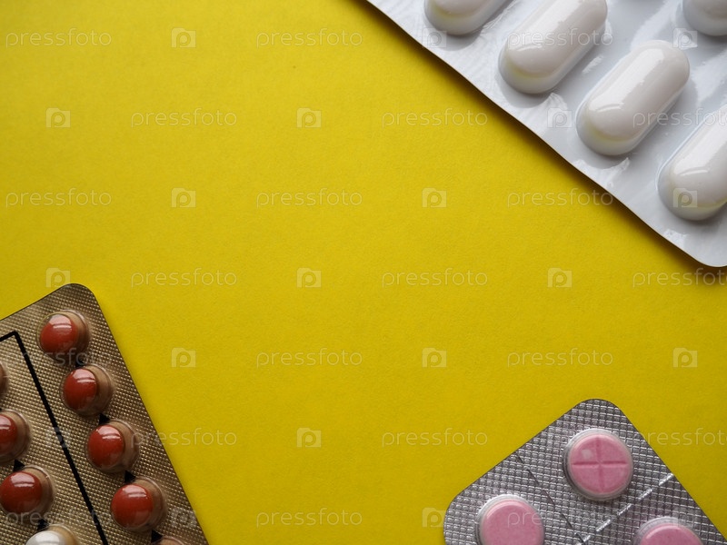 Куча таблеток на желтом фоне. Таблетки, витамины и блистеры с капсулами для лечения заболеваний. Скопируйте пространство