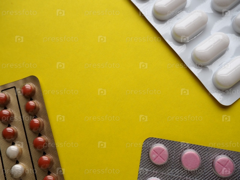 Куча таблеток на желтом фоне. Таблетки, витамины и блистеры с капсулами для лечения заболеваний. Скопируйте пространство