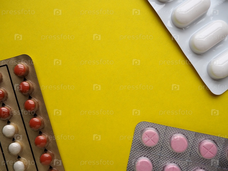 Куча таблеток на желтом фоне. Таблетки, витамины и блистеры с капсулами для лечения заболеваний. Скопируйте пространство