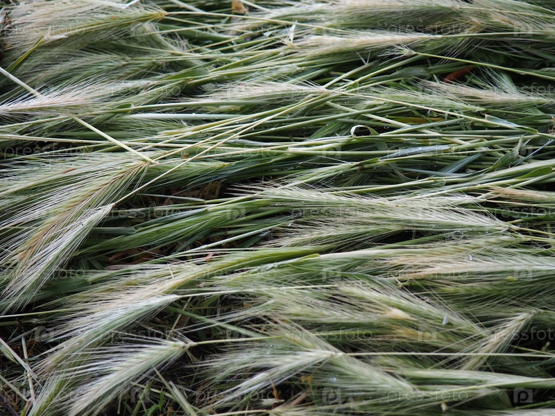 Колосья спелой пшеницы или злакового растения. Семена на стебле и колосе. Естественный спокойный фон. Потеря урожая пшеницы, многие колосья спелых зерен лежат на земле после ветра и дождя. Тема деревенского образа жизни