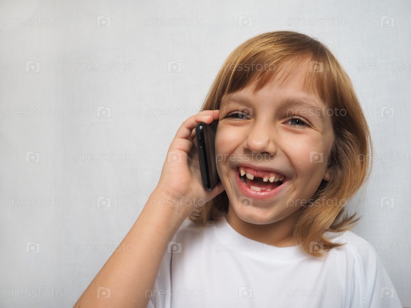 7-летняя девочка без переднего зуба. Ребенок разговаривает по телефону или смартфону и весело смеется. Смена молочных зубов в детском возрасте. Современные коммуникационные технологии. Белая ткань на девушке
