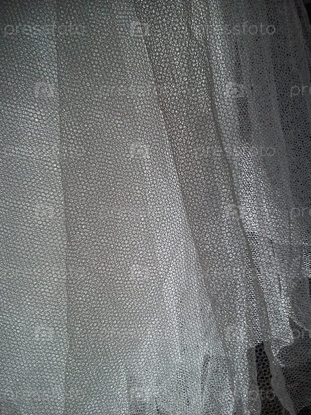 Белая мятая сетчатая ткань. Моющаяся вещь из синтетического материала. Москитная сетка складывается в мягкие складки. Ткань, похожая на фату невесты