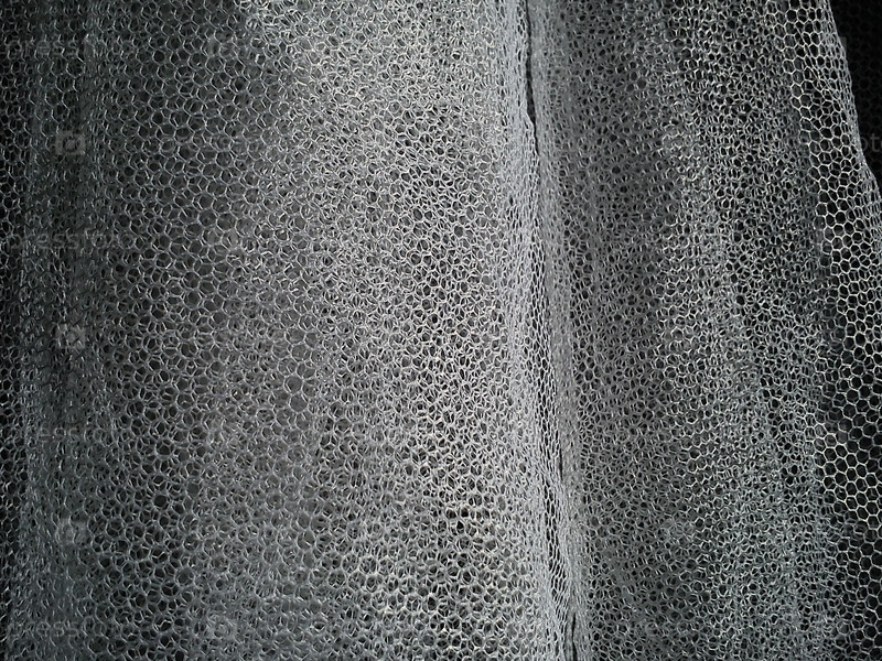 Белая мятая сетчатая ткань. Моющаяся вещь из синтетического материала. Москитная сетка складывается в мягкие складки. Ткань, похожая на фату невесты
