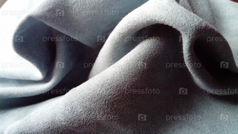 Крупный план бархатистой плотной ткани для штор серо-голубого цвета, хаотично сложенной красивыми плавными волнами с игрой света и тени. Естественный дневной свет