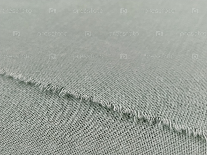Рваный край тонкой шерстяной ткани зеленого или синего цвета. Свободные нити по краю куска ткани. Крупный план. Тканый фон. Спокойный зеленый пастельный цвет
