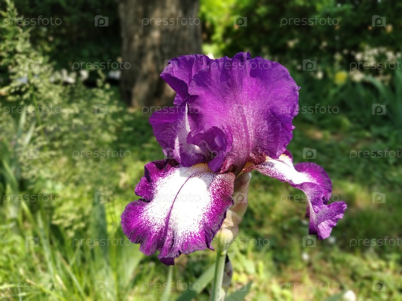 Красивая фиолетовая радужка с белой серединой. Изогнутые изящные яркие лепестки цветка. Зеленый размытый фон. Селекционный сорт ириса. Большой распустившийся бутон. тонкие длинные листья