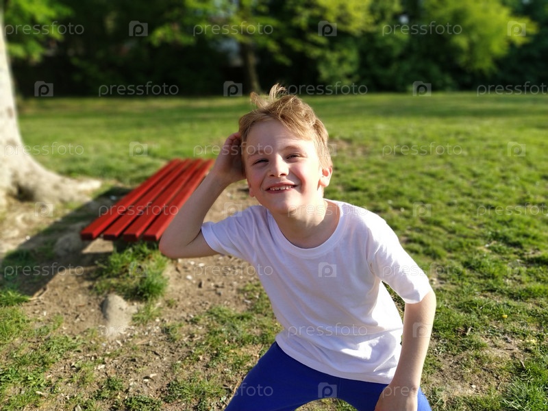 7-летний мальчик со светлыми волосами в белой футболке и синих штанах позирует в городском парке. Ребенок дурачится, сидит на корточках и улыбается. Мягкий фокус