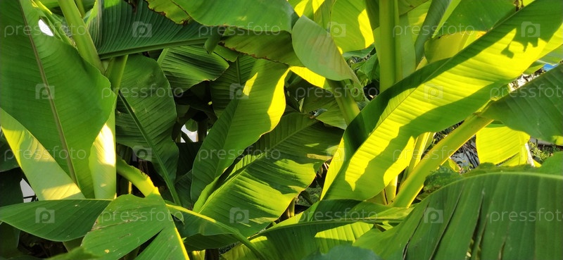 Красивые ярко-зеленые банановые листья на фоне голубого неба. Тропические мотивы. Концепция праздника под пальмами