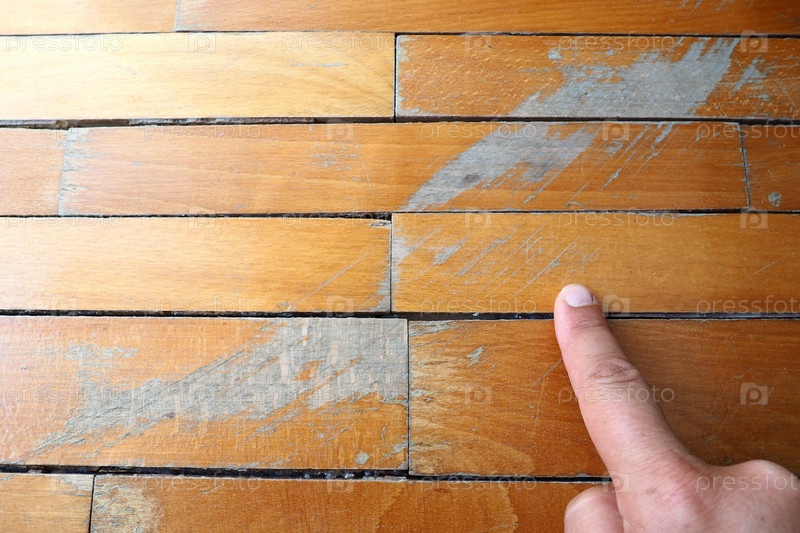 Старый, поцарапанный паркет нуждается в уходе. паркет поврежден царапинами от длительной эксплуатации. Руки мастера показывают повреждение пола