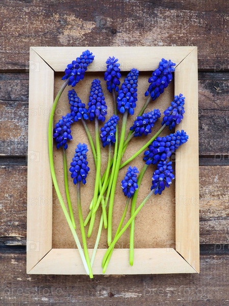 Голубые весенние цветы на деревянной фоторамке. Muscari armeniacum на древесном фоне. Яркая открытка, поздравления. Копируйте космический натюрморт. Темное изуродованное старое дерево. Армянский виноградный гиацинт
