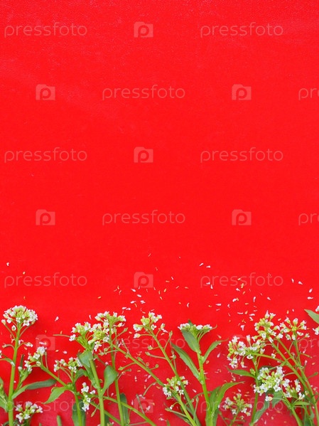 Цветы пастушьей сумки на красном фоне. Копируйте место для текста. Карта для праздника. Красный фон. Белая пастушья сумка Capsella bursa-pastoris, растение семейства горчичных Brassicaceae