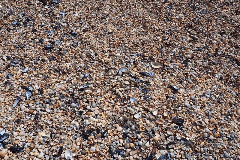 Раковины брюхоногих двустворчатых моллюсков, обитающих в Азовском и Черном морях, Голубицкая. Бежевые, черные, белые ракушки на берегу. Cerastoderma lamarcki, Hypanis colorata, Anadara inaequivalvis